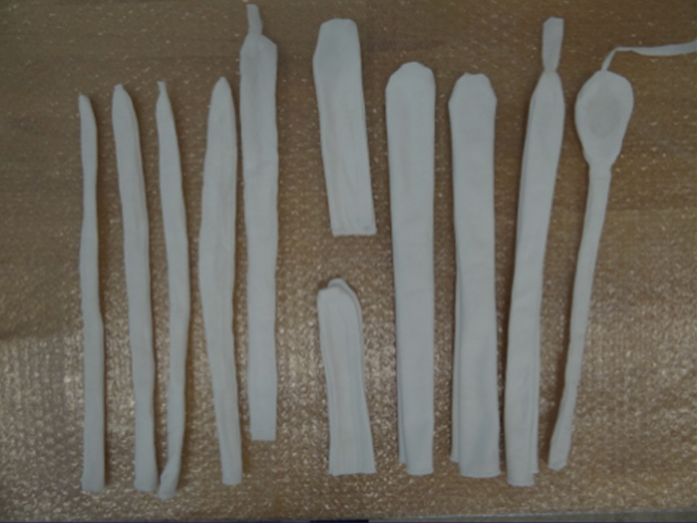 Hieronder te zien, speciale, zelfgemaakte ‘sleeves’ van diverse materialen en in diverse vormen die over een lange wattenstok of buigzame borstel geschoven kunnen worden. Sommigen hebben een lange, dunne ‘tong’ oor verwijdering van vuil uit flessen of een pocket om watjes of ander zacht materiaal in te stoppen voor absorptie of extra bescherming van kwetsbare oppervlaktes.