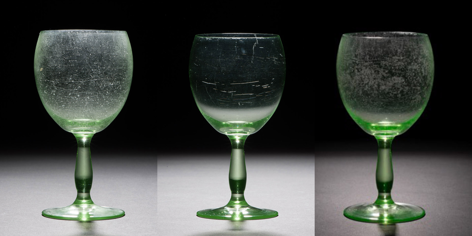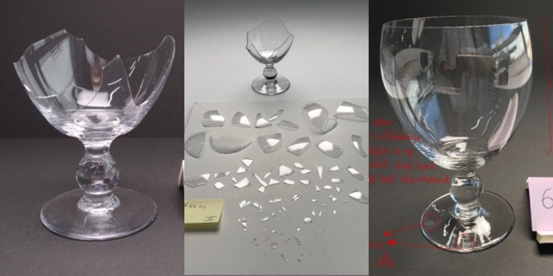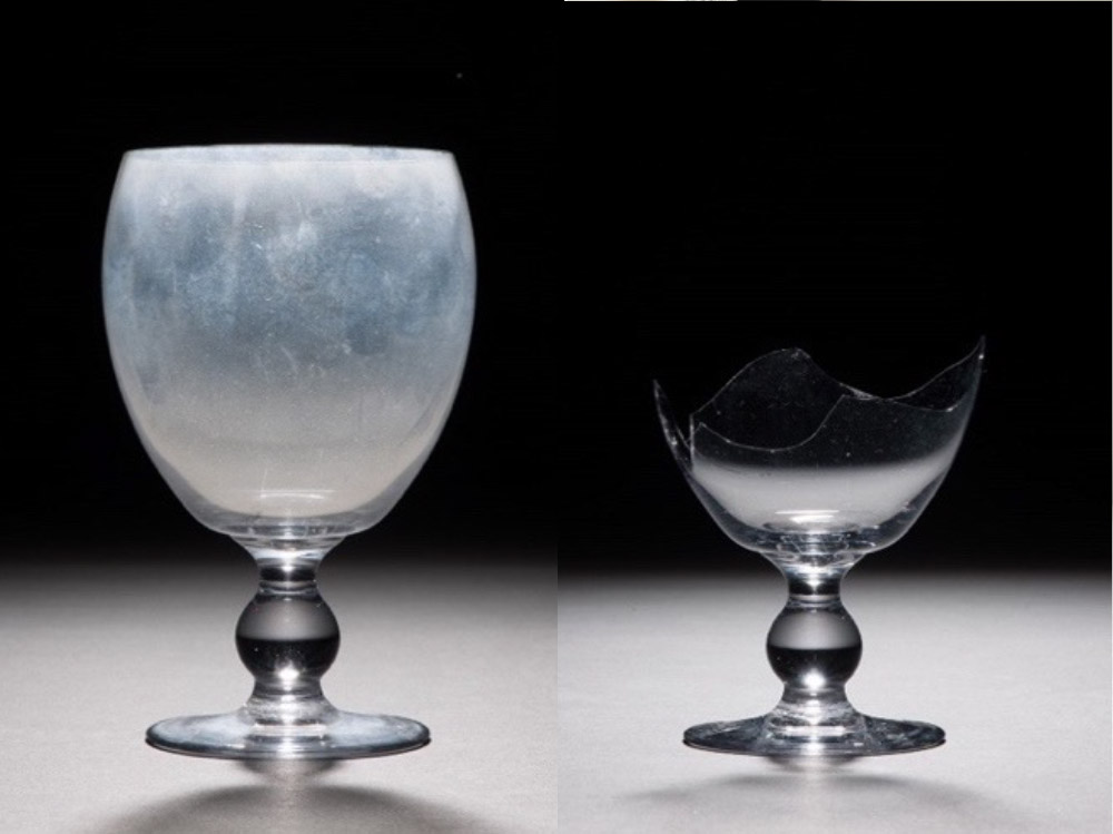 Reinigen betekent dat een glasoppervlak kortstondig aan 100% luchtvochtigheid wordt blootgesteld om vervolgens in beperkte tijd weer te drogen. Bij het schoonmaken moet het object uitgebreid gehanteerd worden. Dit is niet zonder risico’s, zoals uit de volgende casus kan worden afgeleid. Het object is tijdens het drogen, zonder dat iemand in contact met object was, in scherven uiteengevallen. De vraag is of hier sprake was van inherente instabiliteit, waarvan de kenmerken niet visueel nog niet waarneembaar waren. Of is het incident het gevolg van de schoonmaakactie? Helaas is het antwoord op die vragen niet te geven. Een vergelijkbaar object en de scherven zijn in de gidsgroep van Museum Boijmans Van Beuningen opgenomen en worden nauwlettend in de gaten gehouden.