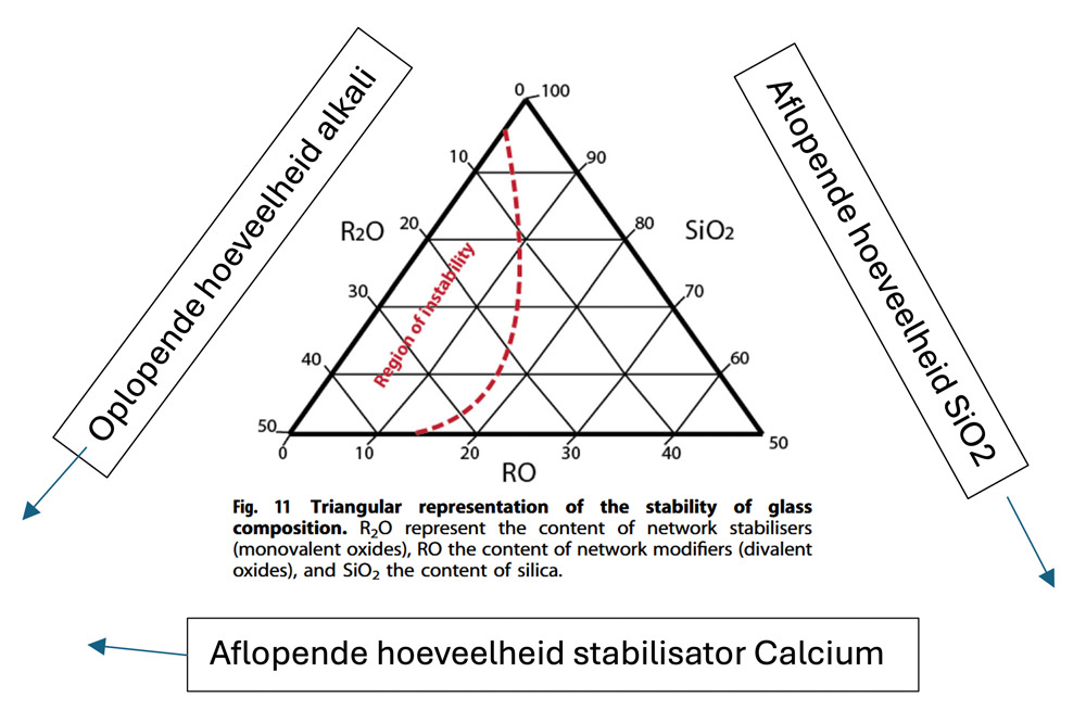 —2 — De receptuur of ingrediënten: een instabiele samenstelling Als er te weinig stabilisatoren in het glas zitten (minder dan 8% kalk – calcium) of het aandeel smeltpuntverlagers is te hoog (natrium of kalium) dan is de verhouding tussen de ingrediënten niet stabiel. (zie: