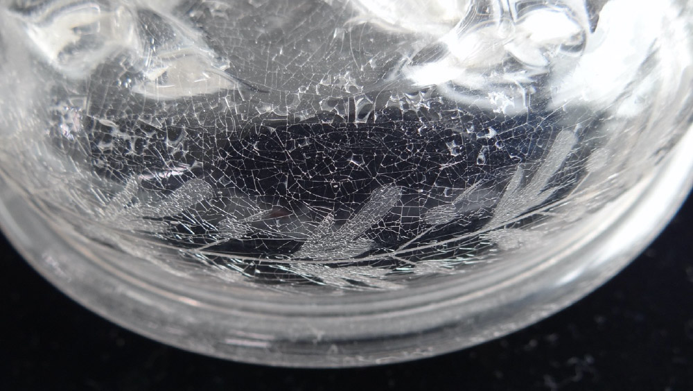 ONDER Cuppa van kelkglas met breuken in diverse richtingen in lijn met de vervaardigingslijnen, gecrizzled in netwerkpatroon als gevolg van atmosferische degradatie. Breuk ontstaan als gevolg van impact (waar ook de lacune het gevolg van is) heeft een ander patroon. Bron zit in bodem, uitwaaiering richting liprand van de kelk.