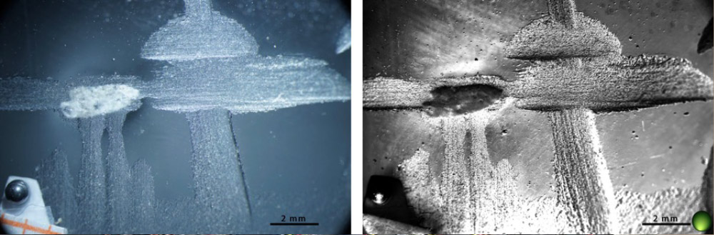 Photomicrograph of engraved glass, Collectie R. Dick - AFBEELDING A. Dittus, 2016, Swiss National MuseumDe morfologie van een koude beschildering op een glasoppervlak kan met RTI goed bestudeerd worden. Barstjes, luchtbelletjes, reliëf en applicatiedetails zijn goed in kaart te brengen.