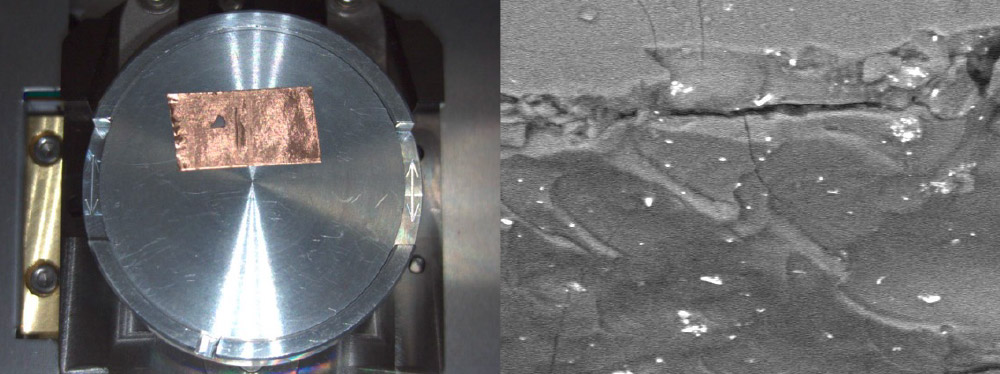 Op de volgende twee foto’s is de analyse van een glasscherfje te zien. Links het scherfje in het apparaat onder lage vacuüm. Rechts de afbeelding van het oppervlak dat wordt gegenereerd. Het laat een gedegradeerde en gebarsten oppervlak van instabiel glas zien.
