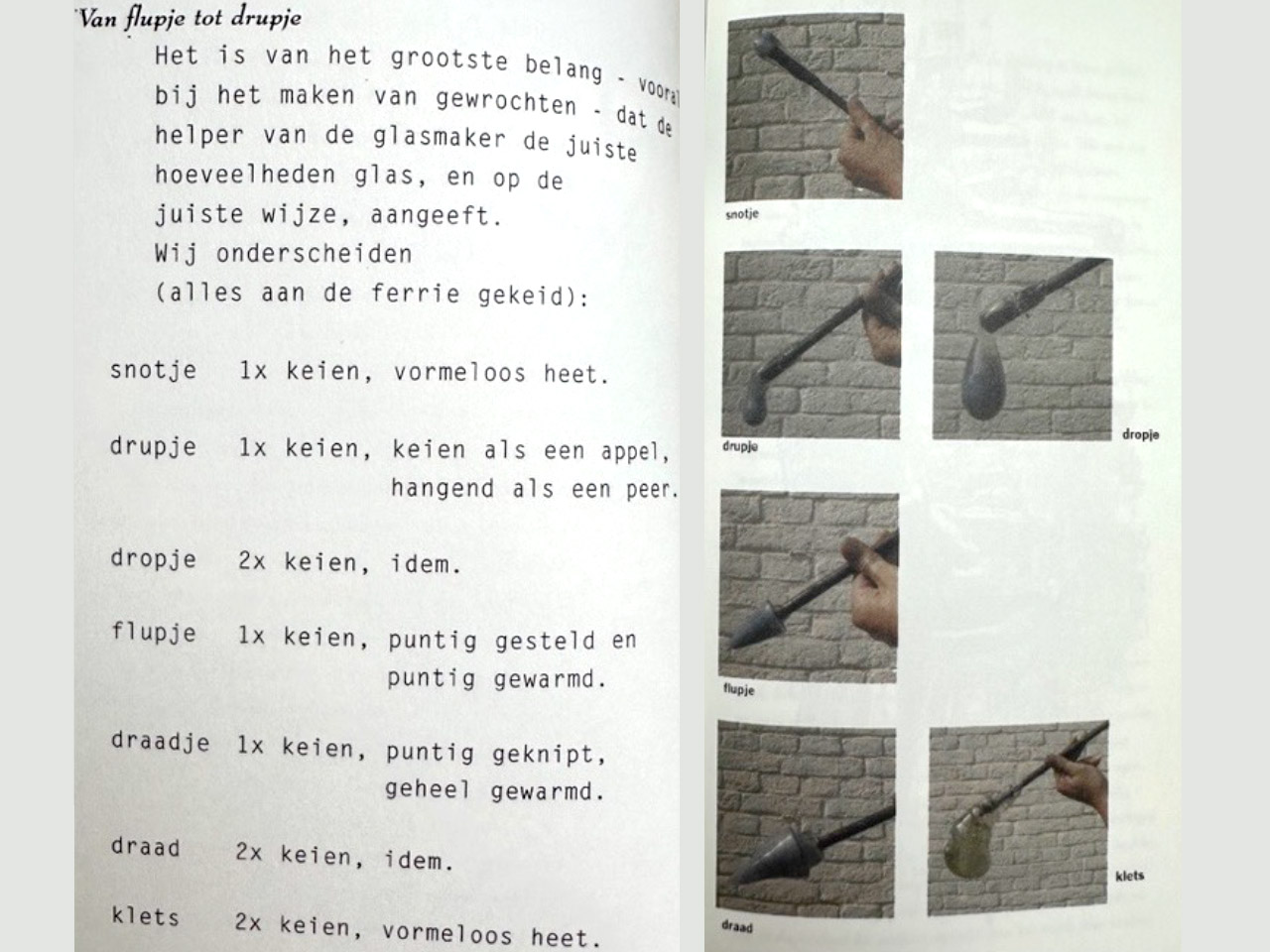 In deel I geeft Heesen o.a. een overzicht van de verschillende hoeveelheid glas in onderdelen aan, zo is snotje, dropje, drupje etc. allemaal omschreven en met foto geillustreerd.