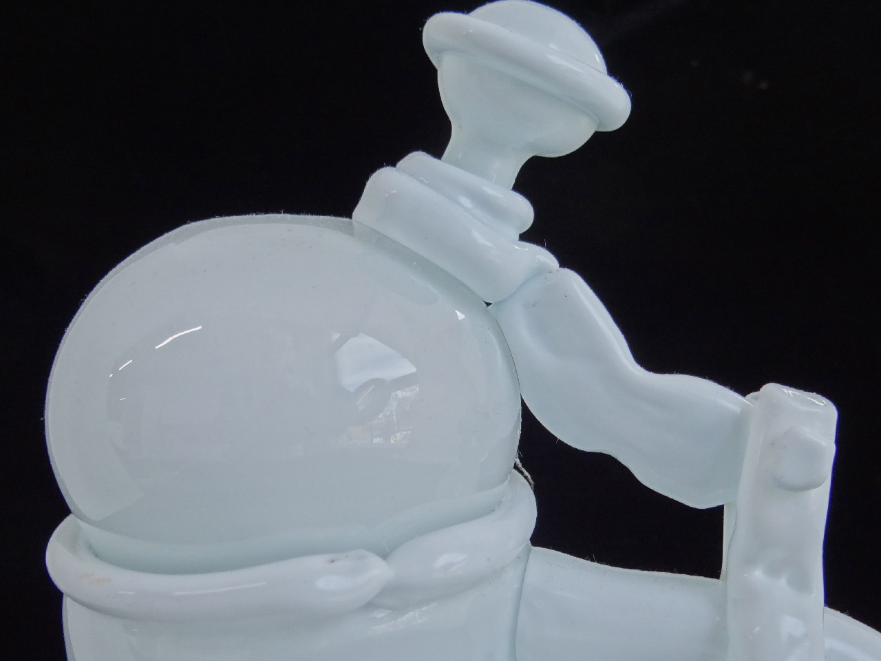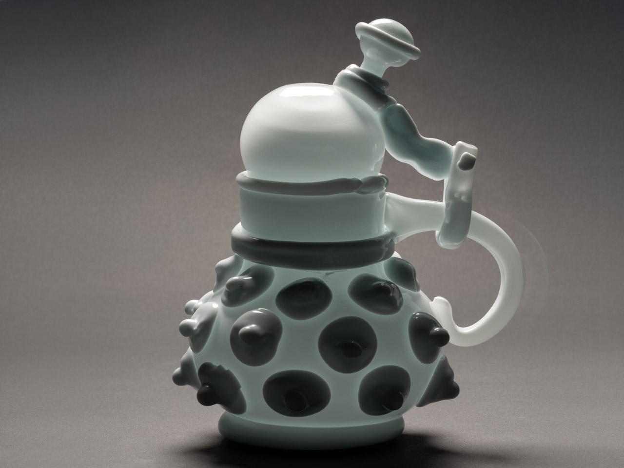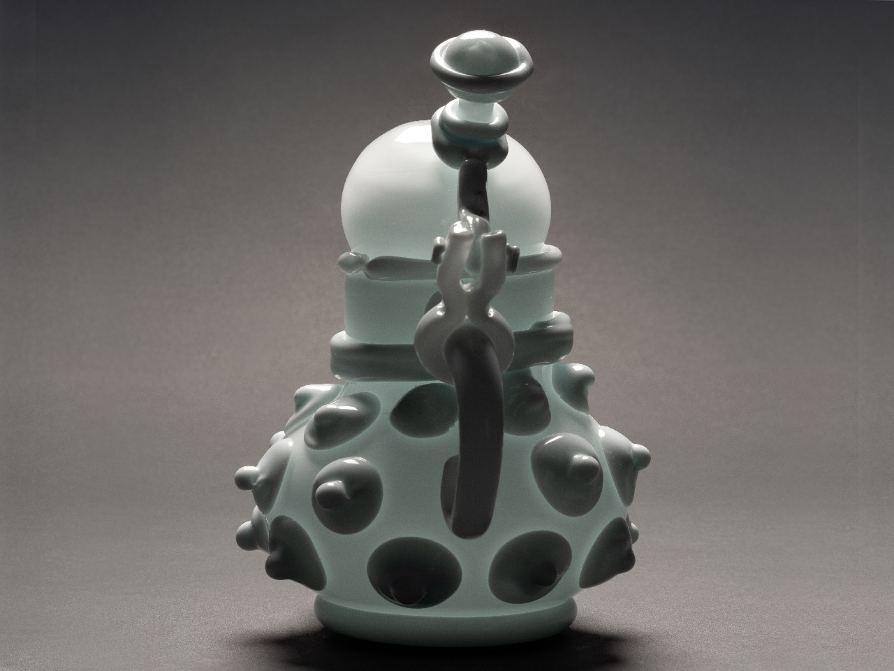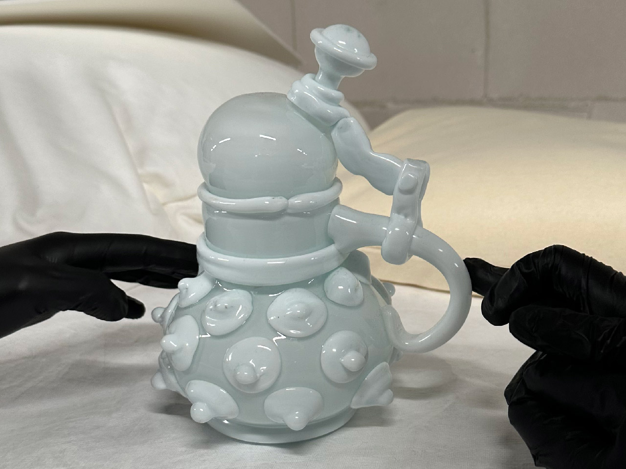 Materiaal opaalglas, wit glasTechniek Hete bewerking: vrij geblazen applicatie van verschillende onderdelen en componenten