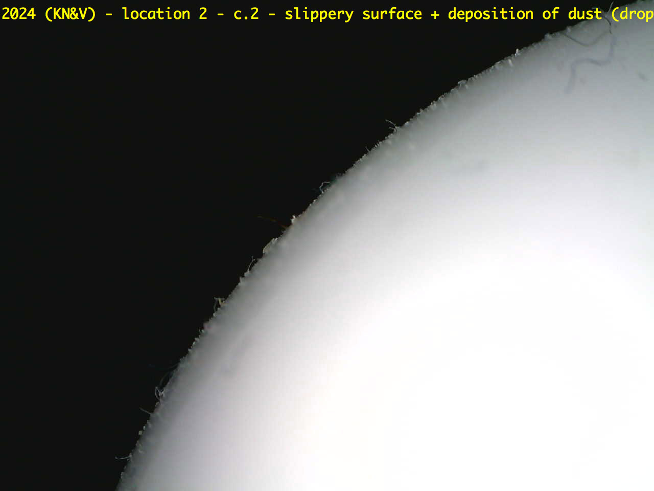 Druppels op het oppervlak, stof blijft hangen (vezels op glasoppervlak). Maar alleen op de mat witte (meer opake delen) die uitsteken. Het glas ertussen heeft dit niet. Hier is een ander type glas toegepast of het witte glas met een transparante kleurloze overvang bedekt.