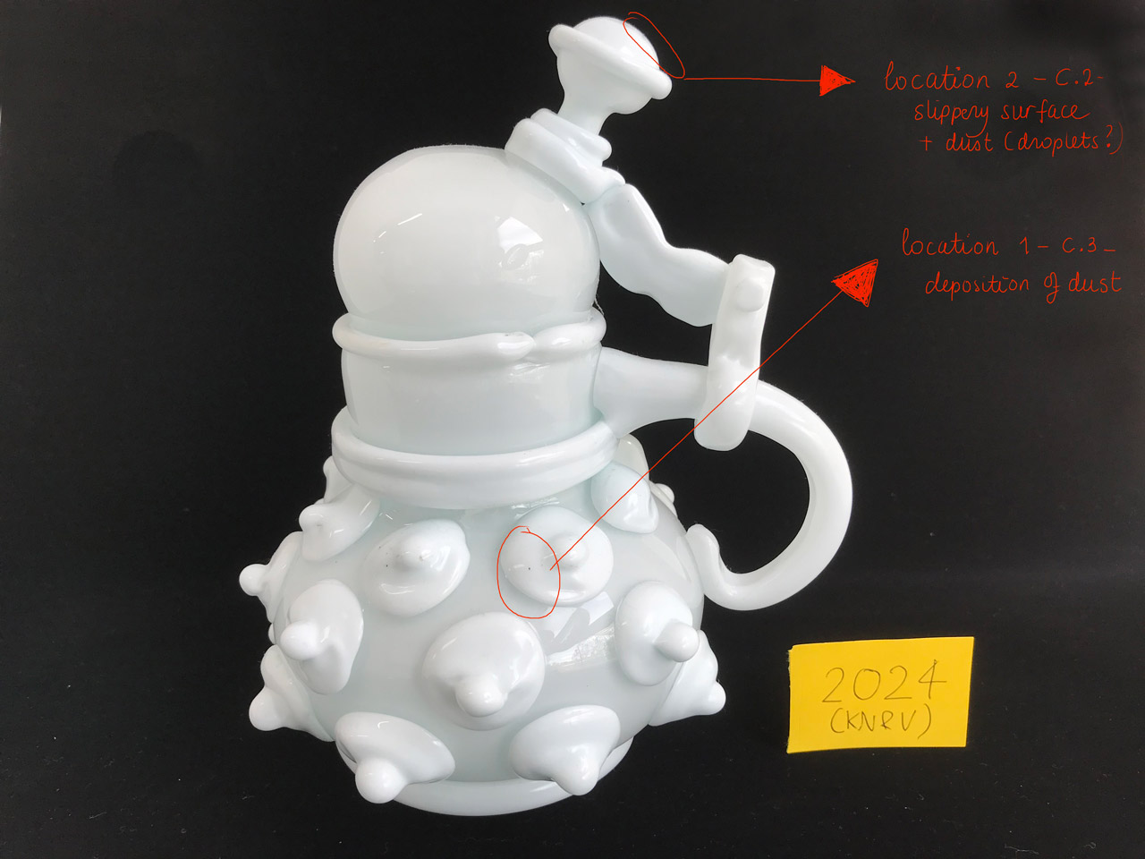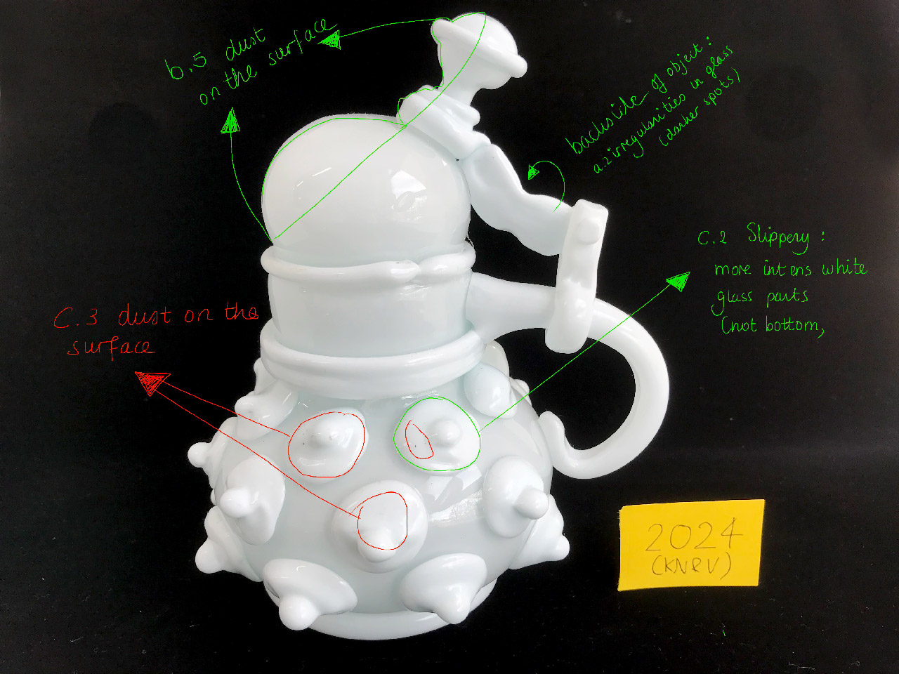 Het object is op diverse momenten in zijn museumgeschiedenis op conditie bestudeerd. Al sinds 2013 wordt er melding gedaan van een glibberig oppervlak op de plekken waar het witte glas niet bedekt is met een transparante glaslaag.