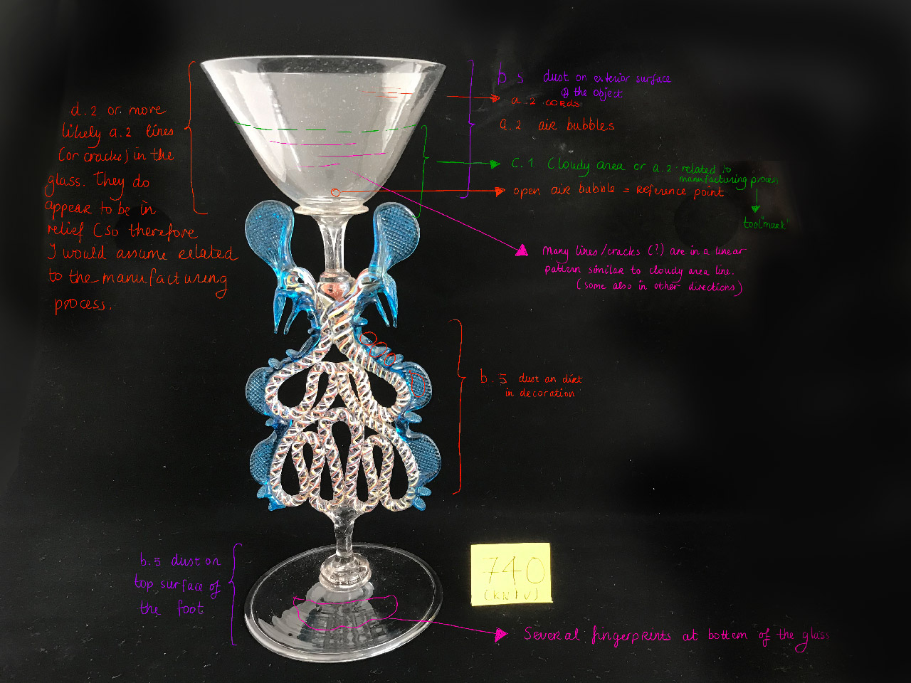 Vanwege de bijzonder kwetsbare toestand van het glas, dient het object uiterst voorzichtig en minimaal gehanteerd te worden.