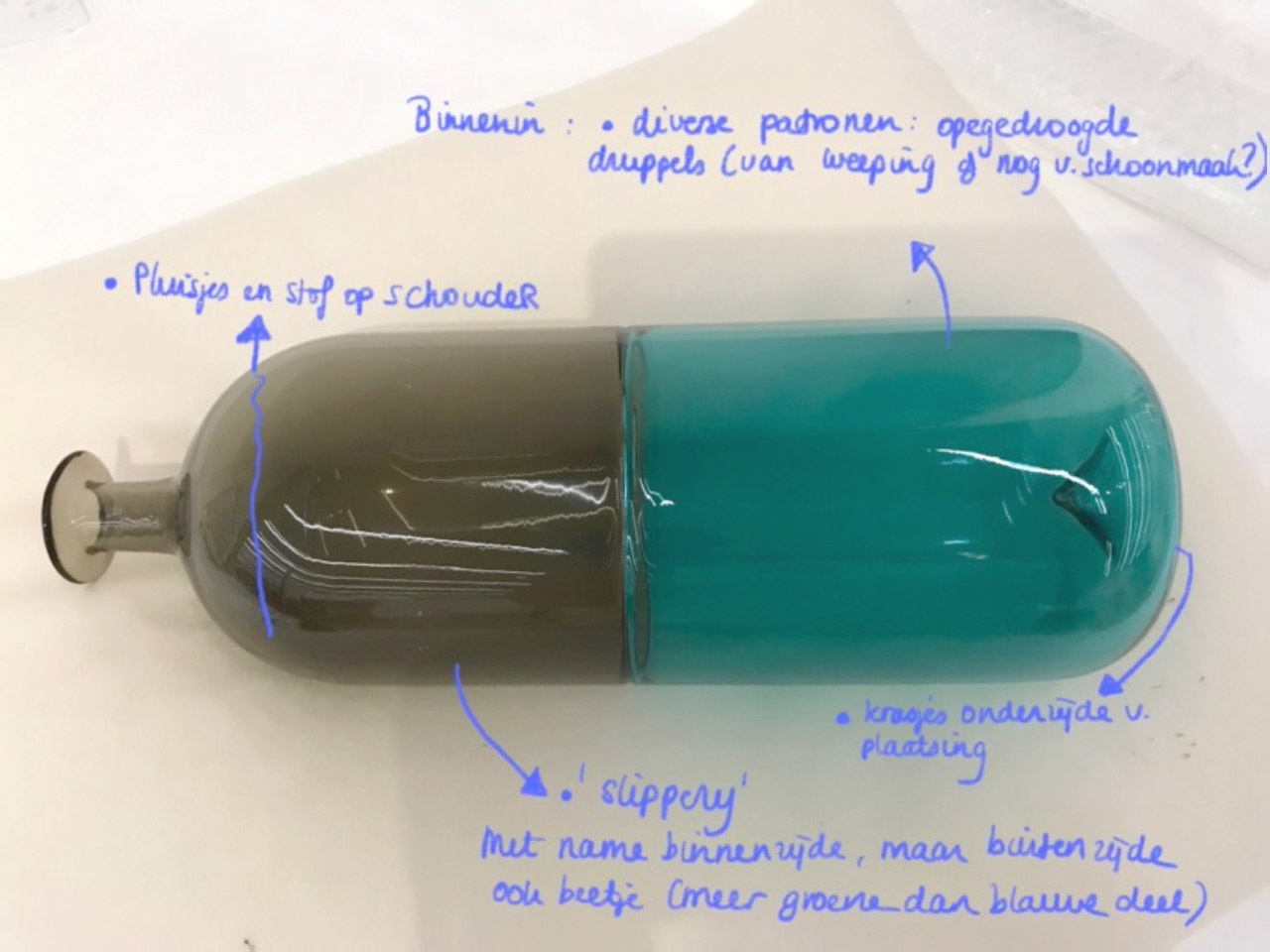 In dit geval zou dat betekenen dat de plastic afsluiting aan de bovenzijde verwijderd zou moeten worden. De vraag is of dat mogelijk en wenselijk is. Er zal dan met speciale sleeves gewerkt moeten worden om het object goed te kunnen reinigen. De technieken zullen rekening moeten houden met de flesvorm van het object.