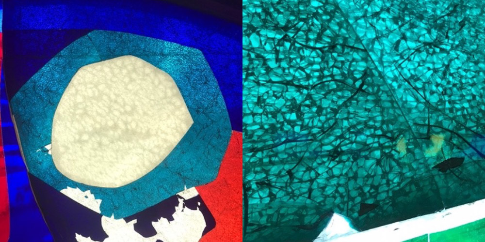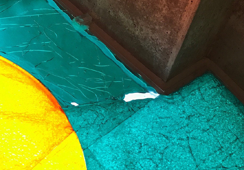 Toegepast achter laag van gekleurd glas in Appelwand, Hofpleintheater Rotterdam, 2025.