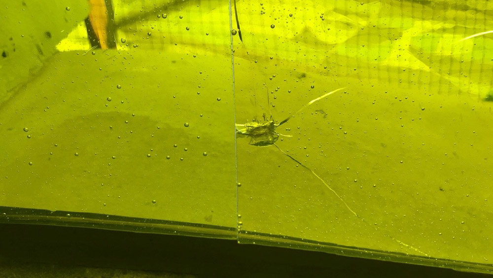 RECHTS ontsnapte spanning als gevolg van lichte impact. Locaties waar zich grotere ruimte tussen de twee kanten bevindt, zijn donkerder van kleur. Lichtbreking in ieder deel van de breuk anders.