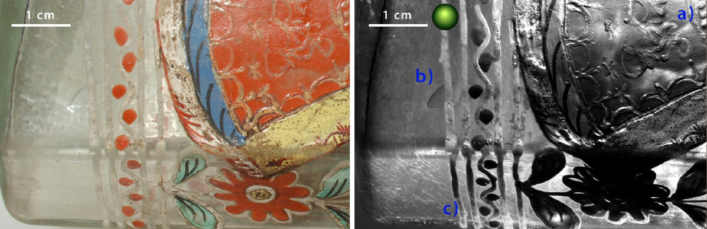 Photomicrograph of engraved glass, Collectie R. Dick - AFBEELDING A. Dittus, 2016, Swiss National MuseumDe morfologie van een koude beschildering op een glasoppervlak kan met RTI goed bestudeerd worden. Barstjes, luchtbelletjes, reliëf en applicatiedetails zijn goed in kaart te brengen.
