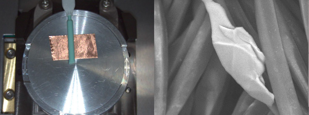 Op de volgende twee foto’s is de analyse van een wattenstokje te zien. Dit wattenstokje is gebruikt om het oppervlak van instabiel glas mee te bemonsteren. In het wattenstokje zijn stukjes glas van bijna pure silica waar te nemen. De alkali bestanddelen zijn in dit geval volledig uit het glas geloogd.