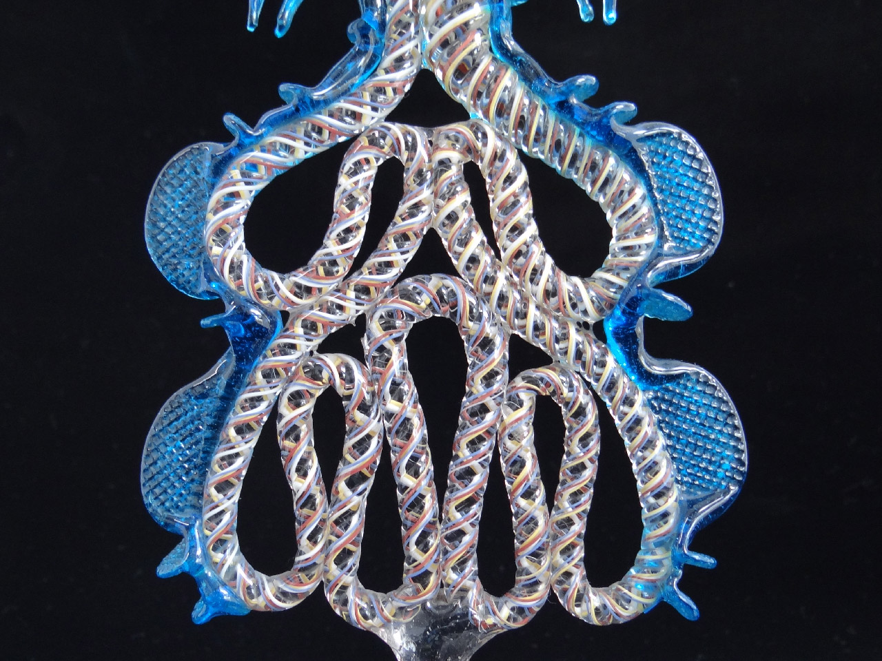slangenglas Hete bewerking Optische patronen, applicatie, uit diverse heet gevormde onderdelen opgebouwd. Aan de pijp geblazen en dan overgenomen op een “pontil” met de hand zijn geopend en gevormd